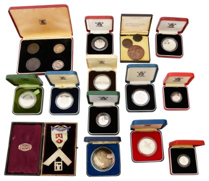 first in the form of a set square suspended on a ribbon with enamel badge, engraved 'Engraved Lodge 599', cased together with a cased Britannia standard silver Albert Schweitzer 1875-1965 commemorative medallion, George III twopence and penny, 1797, George IV half crown, 1826, William IV half crown and cased Royal Mint silver proof coins in capsules with certificates: 1977 silver jubilee crown, 1980 Queen Mother 80th crown, 1981 Charles & Diana Crown 1985 £1 piedfort, 1990 Queen Mother 90th Crown,1992 10 pence piedfort,1993 40th Coronation Anniversary Crown,1993 £1 piedfort, 1994 D-Day Fifty Pence, (qty)