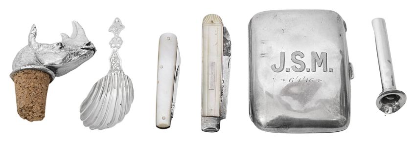 first Sheffield, 1836, by Nathaniel Creswick & Co., second London, 1887 by Charles Boyton (II), with scalloped bowl and foliate engraved handle, third Birmingham, 1980 by Henry Matthews, stamped patent, a plain cigarette case initialled J.S.M. and dated 1916, a modern novelty plated bottle stopper in the form of rhinos head, (6)