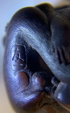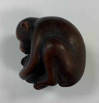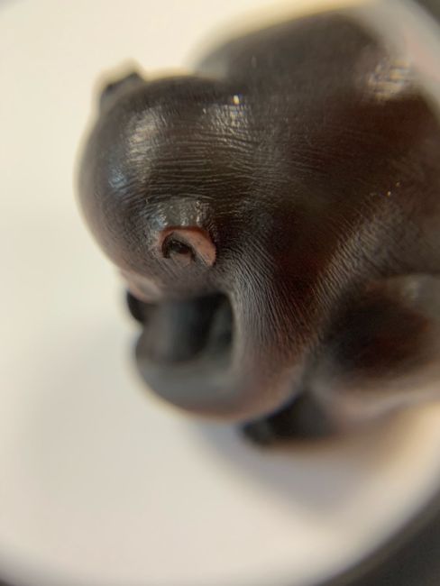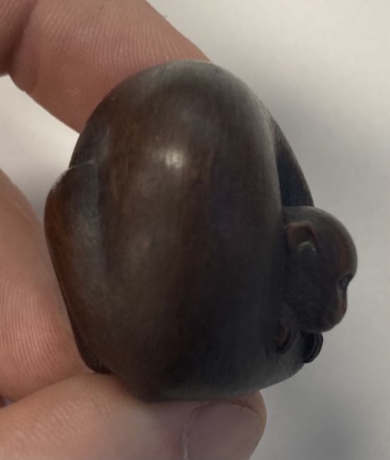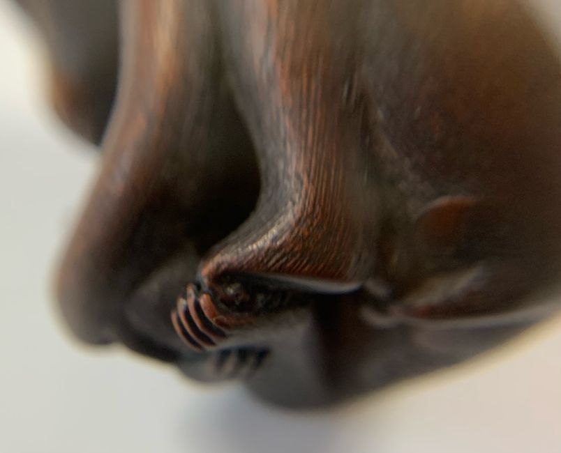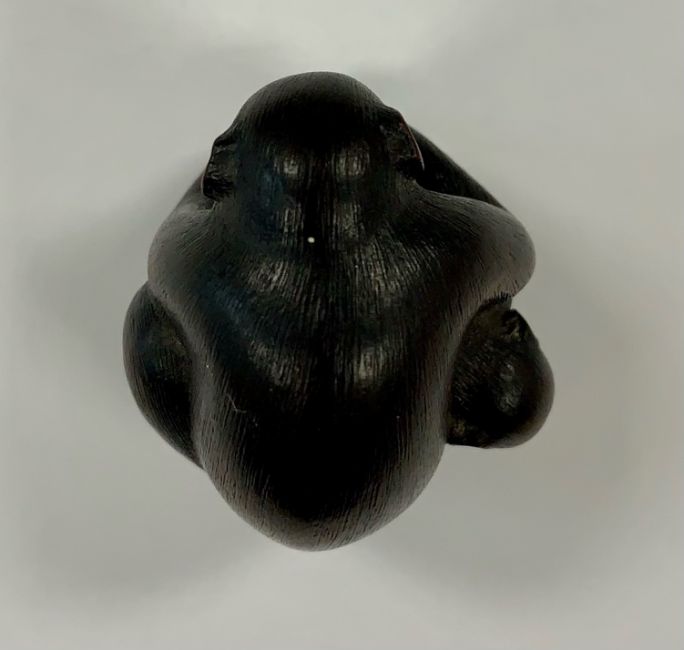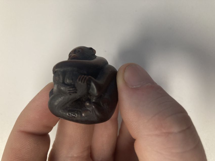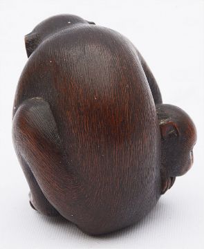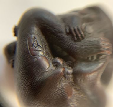 naturalistically carved leant forward holding it's young, signed, the eyes appear to be horn on the mother and baby possibly two different colours