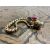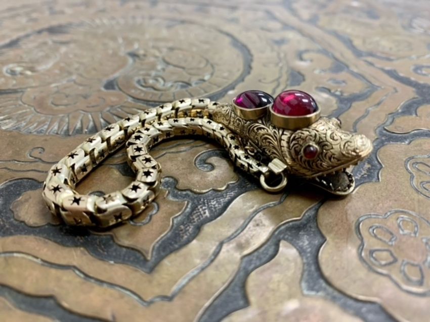 the scrolling-engraved head collet-set with two garnet cabochons, with open jaws and a pair of garnet cabochon eyes, the articulated tapering body composed of pierced star links, later safety chain