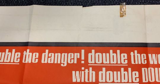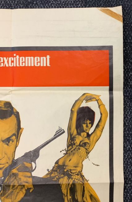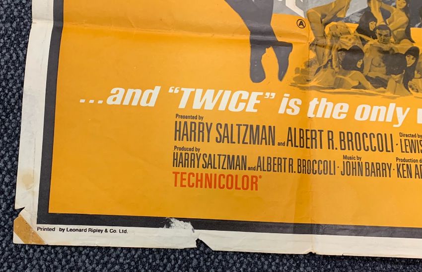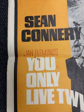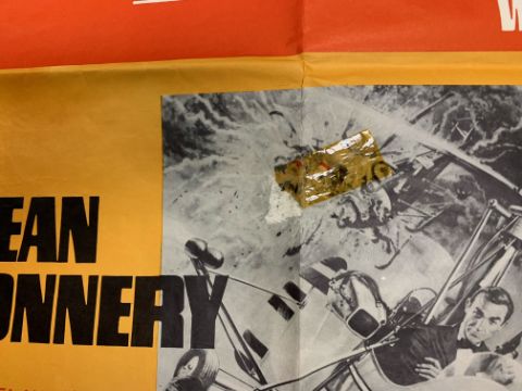 Condition: Double Bill poster: Condition poor - losses particularly to right hand and lower edge, tape marks visible to all corners and centre edges, tape to YOLT artwork, corners folded, surface loss to lower edge, some staining and marks to centre. Souvenir Brochures: Generally good condition some surface dirt. Bond in Focus with wear to cover.