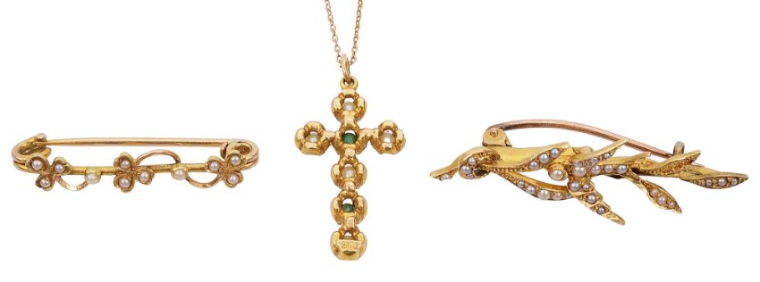 the first 15ct gold spray brooch with a swallow set with seed pearls, another with twisting clovers set with seed pearls, the pendant in the form of cross set with alternating seed pearls and turquoise on a fine gold chain (3)