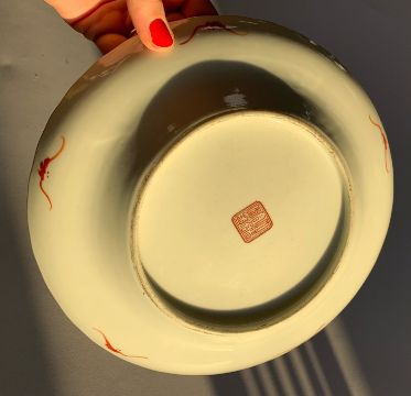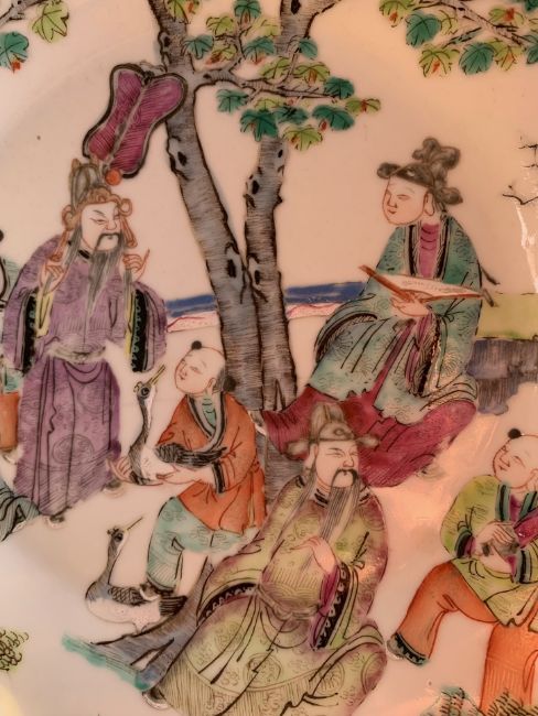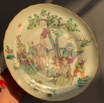 first decorated with seated courtiers and attendants under a tree in a landscape, gilt rim, iron red, second painted with willow, peony and rockwork, ochre rim, (2)