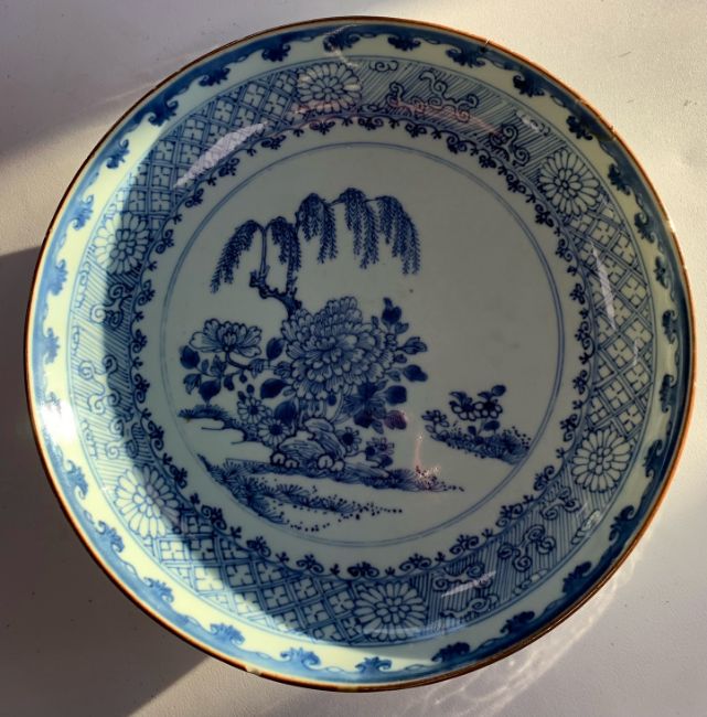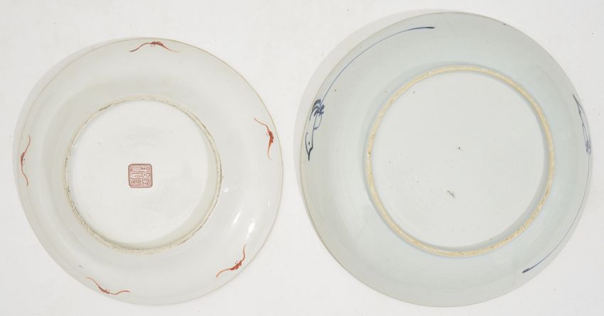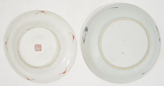 An early 19th century Chinese famille rose dish and an 18th century blue and white export dish