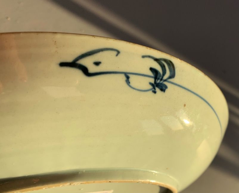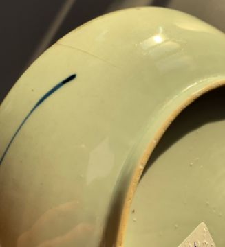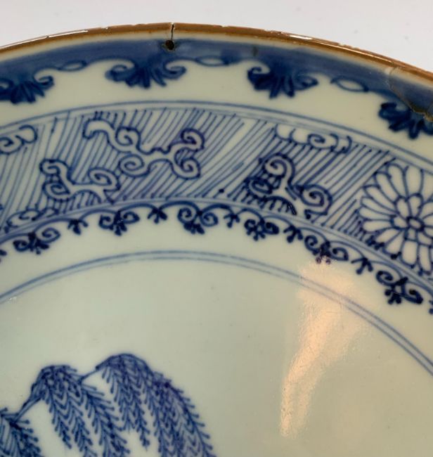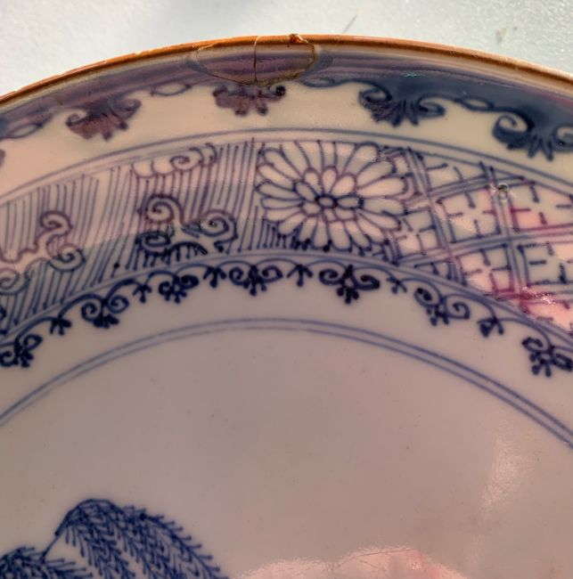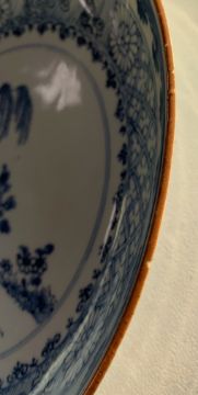 Condition: First some rubbing to gilt rim. Otherwise in good condition. Second a small chip to rim, other smaller fleabites. Another section with small repair to rim with a hairline. A very small filled drilled hole to rim