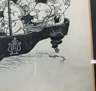 an original humorous cartoon, pen and ink heightened with gouache on paper, signed to lower right, framed and mounted,