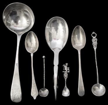 A Georg Jensen pattern no 21 silver sugar spoon, a George III Old English pattern sauce ladle and. other spoons