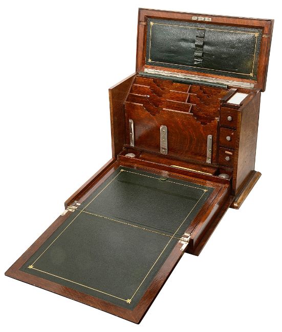 the hinged slightly domed lid and fall front inlaid with fan marquetry paterae opening to reveal a fold out writing slope inset with dark green gilt tooled leather and a fitted interior with a letter rack, three small drawers, pen rest and twin inks, bears shield shaped presentation plaque dated 1910