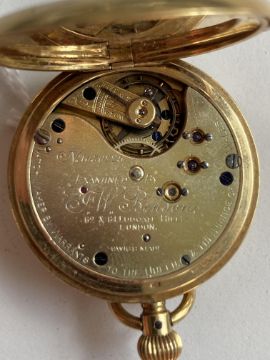 An 18K cased Benson half hunter pocket watchthe outer chapter ring with pink enamel and blued Roman numerals, with enamel dial, Roman numerals and subsidiary seconds, the reverse of the case with , movement signed Benson and numbered 1030225width of case approx 3.5cmCondition: The pink enamel in very good clean condition. Winds ticks and runs however no gurantee can be offereda s to the full working order. Case back mongrammed M A. Dust cover is marked 18K. Hailrine crack to dial from XI to II. Case diamter 35 mm., gross weight approx. 38.3g.  Crack to dial.