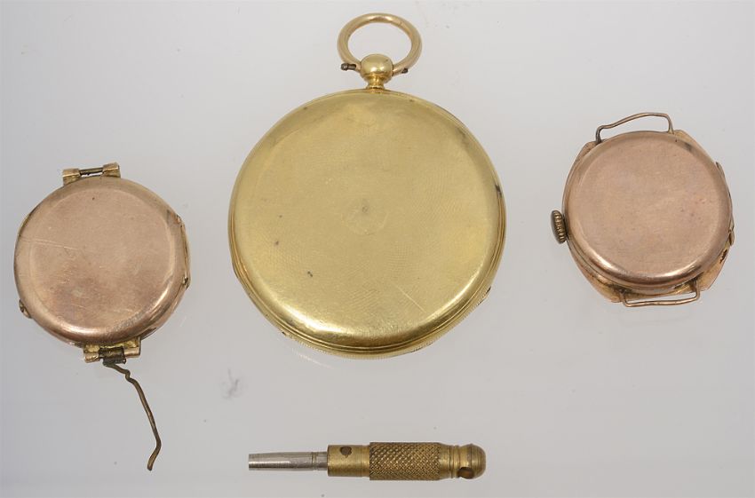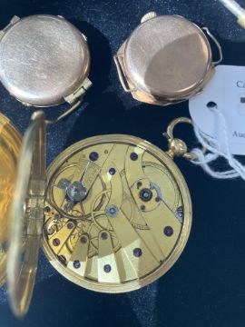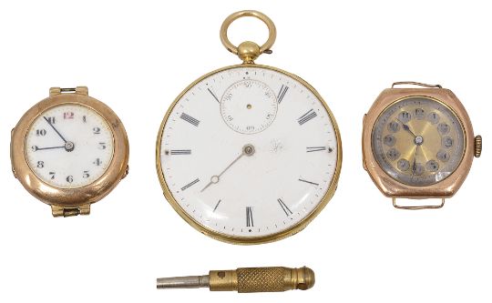 A late Victorian key wound open faced pocket watchthe enamel dial with Roman numerals and subsidiary seconds a/f, the key wind movement signed Le Compte Geneve, probably 18ct but unmarked, together with two 9ct wrist watch movements a/f (3)diameter of dial approx 4.2cmCondition: The fob watch with holes to dial at 3 and 9, missing minute hand and hand to subsidiary seconds. Winds, tick and runs however no gurantee can be offered as to the full condtion. Glass present. Case diamter 43 mm., gross weight approx. 46.2g  the second both with defects.