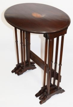 of graduated form, each with oval inlaid top inlaid with a Sheraton inspired motif, on turned legs (3),