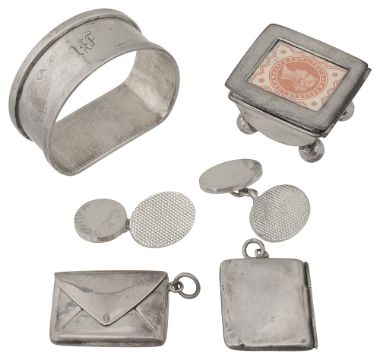 comprising a square sterling silver stamp box with open window and sprung lid raised on four ball feet, together with two silver stamp envelopes, a pair of silver engine turned cufflinks with chain links, and a single napkin ring (5)