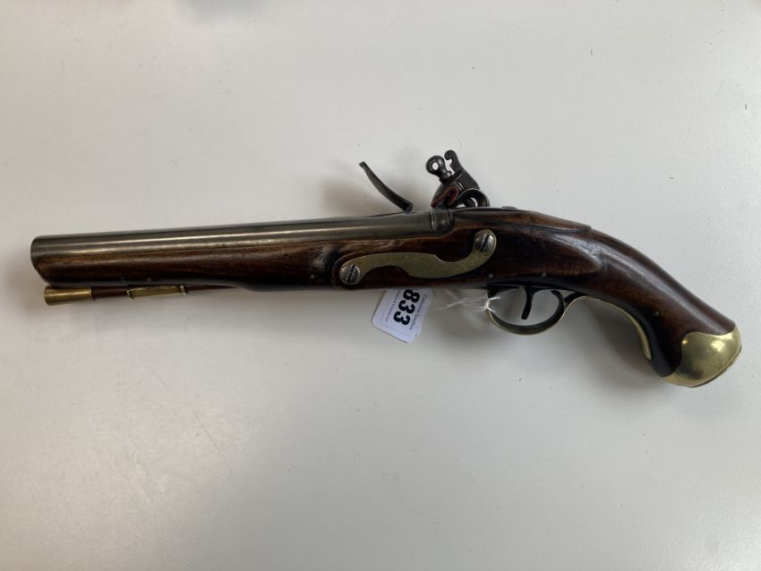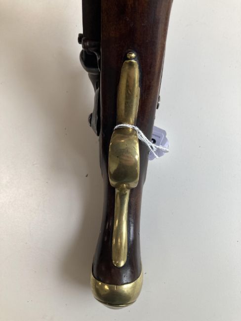 the 9" barrel with tower proof marks signed D. Egg London, lock plate bearing George III cypher and also signed D.Egg, walnut full stock, regulation brass butt cap, side plate and trigger guard, brass tipped ramrod, on perspex stand, accompanied by a sleeve