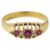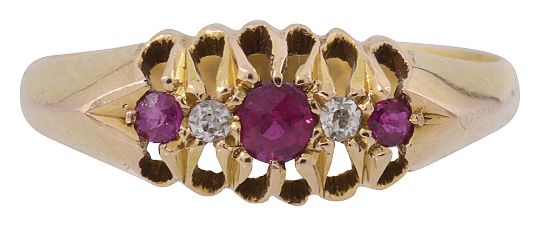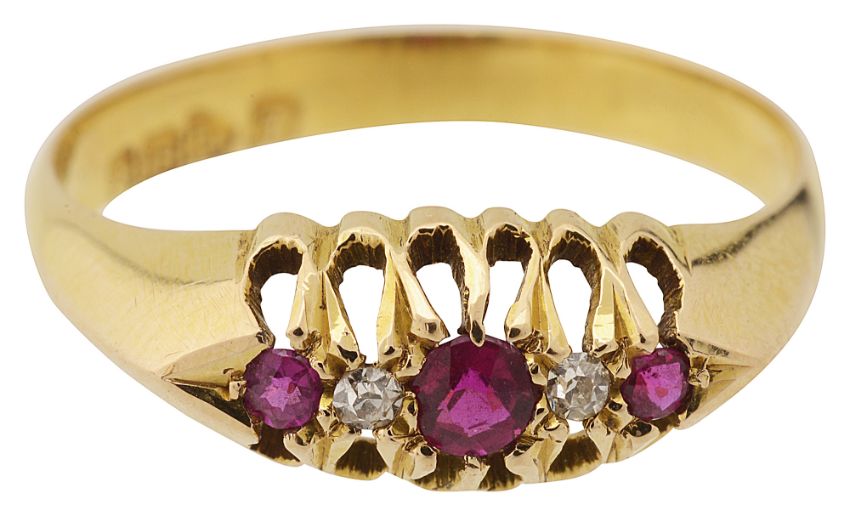 An early 20th century ruby and diamond five stone ring, set with three circular-cut rubies separated by a single-cut diamond, to the 18ct yellow gold setting, Chester 1919