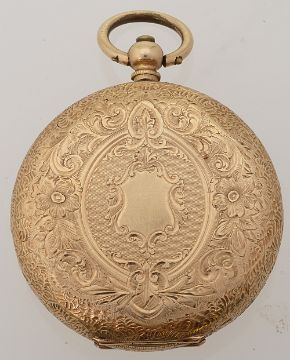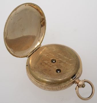 with engraved floral description to centre and Roman numerals to the chapter ring, with presentation inscription to the dust cap and chased foliate decoration to the reverse