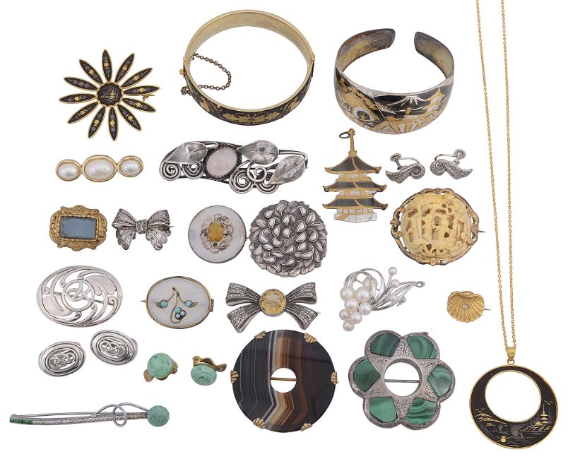 A collection of Victorian and later jewellery including a Chinese carved ivory figural brooch in Victorian scroll frame, a silver and malachite bow brooch, a citrine and marcasite ribbon brooch, a rose quartz set foliate and scroll brooch, a Victorian banded agate brooch, an oval 19th century turquoise 'forget-me-not' and chalcedony brooch, a circular chalcedony and citrine brooch, a seed pearl set scallop brooch, a contemporary Japanese brooch and pendant on chain by Amita, a cased Japanese chrysanthemum brooch, and a simulated pearl brooch by Dior (qty)