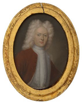 'portrait miniature of a gentleman, wearing a full wig and red coat', oil on copper, oval, gilt gesso frame
