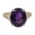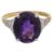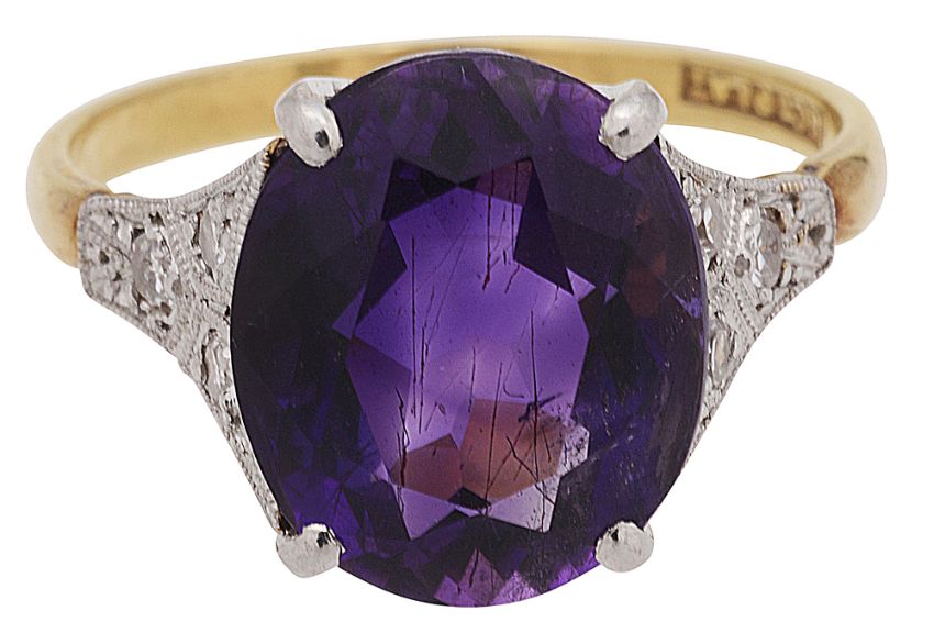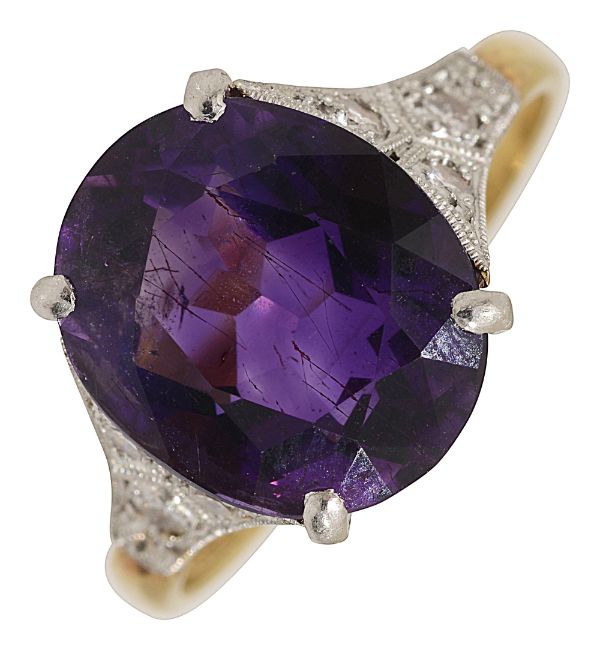 An amethyst and diamond-set ring, the oval amethyst claw-set above the ornate shoulders, each set with three single-cut diamonds, to the plain shank stamped '18ct PLAT'