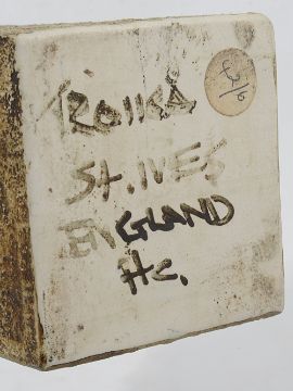 decorated with impressed and incised geometric designs on a grey ground, painted marks Troika St Ives England, HC