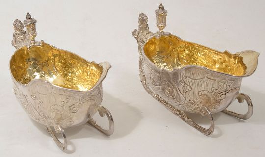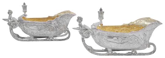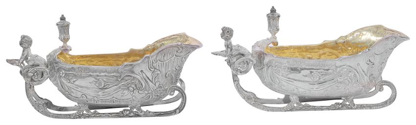 cast in the form of a sleigh with foliate scroll decoration with lantern finials and figural putto handles, gilt interiors, (2)