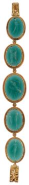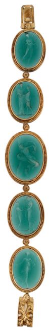 A mid/late Victorian green paste and yellow gold bracelet by Phillips of Cockspur Street, London, the five graduated oval green paste intaglios depicting various mythological figures such as Ganymede, two signed in Greek lettering for Luigi Pilcher, each within a yellow gold collet and spherical beadwork border, and separated by a flowerhead roundel link, to the rectangular stylised anthemion clasp stamped with a rhomboid containing the adorned Ps with plumed crest for Phillips, bracelet length 17.0 cms, largest intaglio collet 3.1cms x 2.4 cmsCondition:Please note this now has a cracked panel