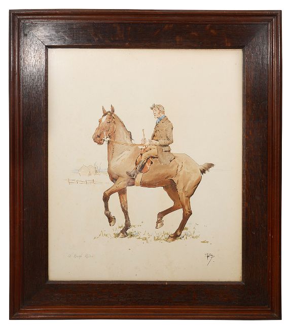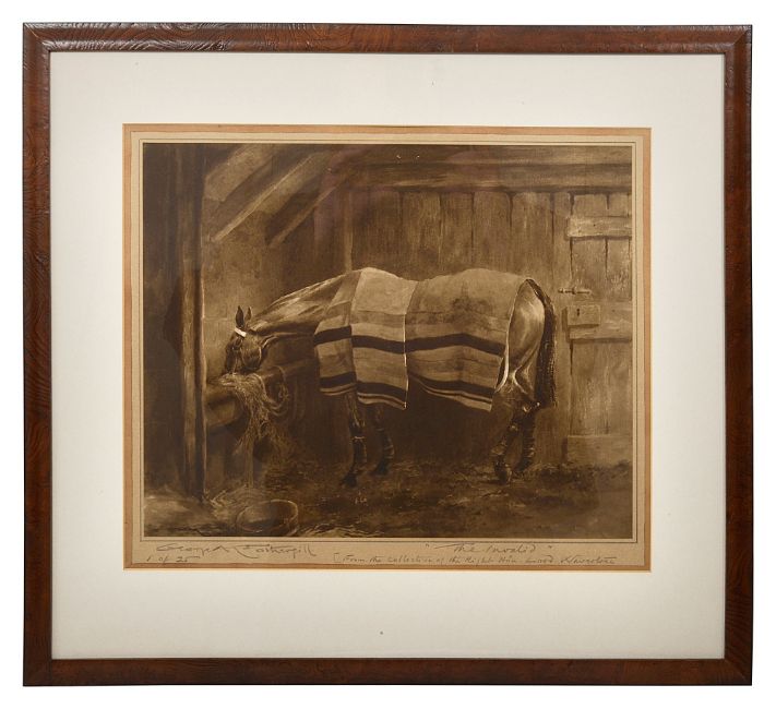John Cother Webb (British, 1855-1927), a mezzotint engraving after John Charlton, fox hunting scene, inscribed 'Yours truly, Fred C. Morgan'; after George Algernon Fothergill (British, 1868-1945) 'The Invalid', signed and inscribed 'From the collection of the Right Hon Lord Wavertee'; after Fred Hall 'A Rough Rider', published by Robert Dunthorne, all framed, (3)