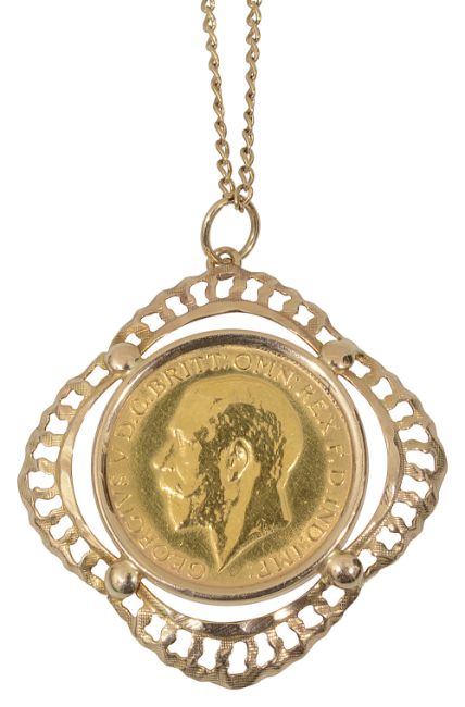 A George V full sovereign on a 9ct gold mount and chain