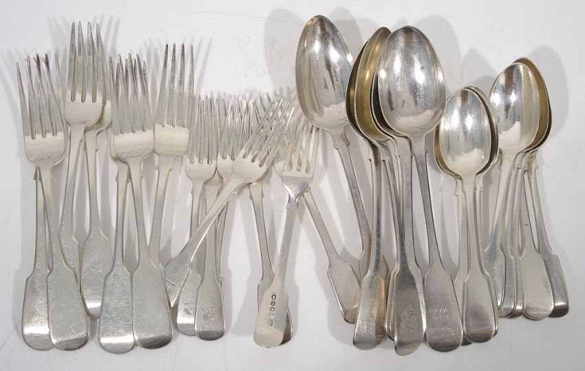 comprising six tablespoons, seven table forks of which two Newcastle, 1834 by John Walton, nine dessert spoons, and seven dessert forks, mostly crested and initialled (29)