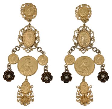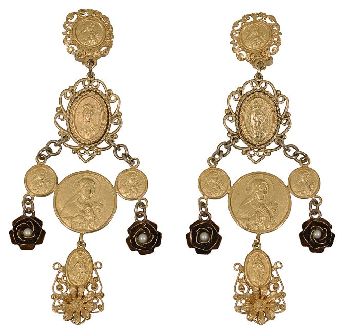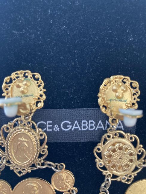 with relief Madonna pendants, flower charms with central simulated pearl detail and flower embellishment, with clip fastening and makers name to reverse with Dolce and Gabbana box