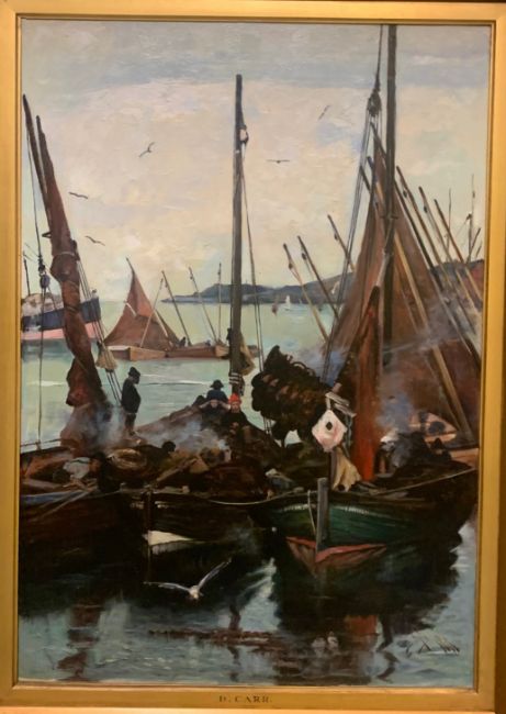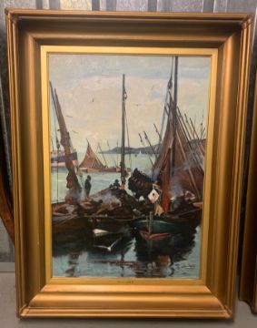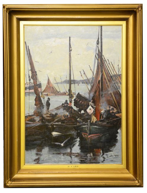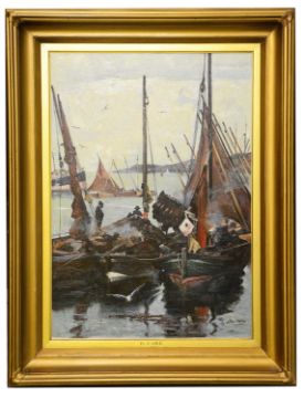 'Fishing Smacks', oil on canvas, signed and inscribed, bearing label verso, inscribed with artists name and title,