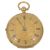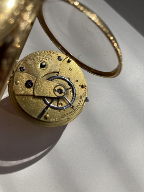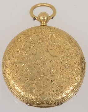 An 18K gold cased open faced pocket watch with floral engraved dial with gilt chapter ring and Roman numerals and dot minute markers , the reverse of the case heavily chased with floral decoration, the movement signed Henry Henderson London No 15504, key winddiameter of dial approx 4cm., total weight approx 44.7gCondition: Movement not tested or guaranteed. Some rubbing to Roman numerals particularly around II and III. Inner dust cover is marked 18K and is free from inscriptions. Movement does not wind. Case diamter 40mm.