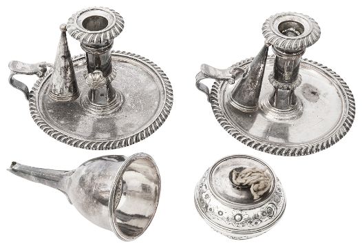 Condition: Some bleeding to Sheffield plate items. One candlestick with ejector knob detached but present. Wine funnel with slight tears round spout.