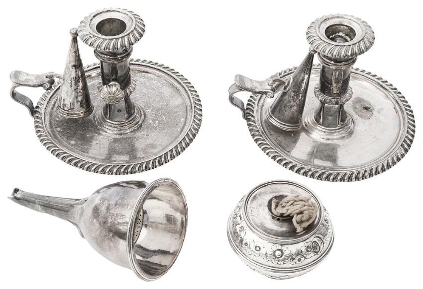 the burner, no town mark but London, 1817, makers mark W.E, of compressed circular ogee form, embossed with flowers and scrolls, crested, the chamber sticks on circular bases with gadrooned rims, the sockets with side ejectors on slotted stems to take a wick trimmer, both with conical extinguishers, crested, (4)