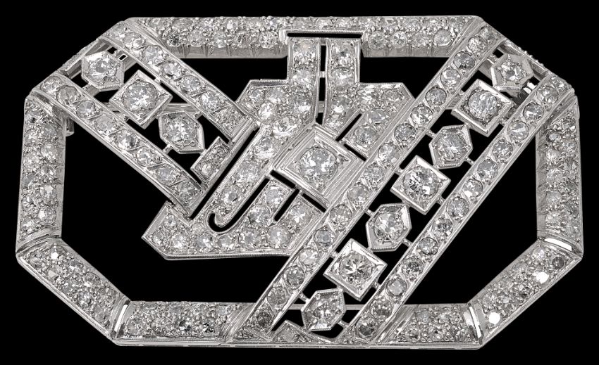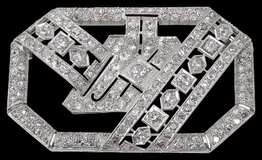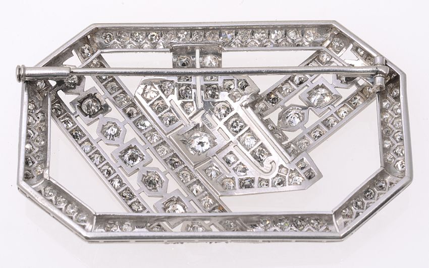 A diamond-set brooch, the shaped rectangular open-work plaque with geometric bar detail, set throughout with brilliant-cut and single-cut diamonds, later brooch fitting