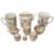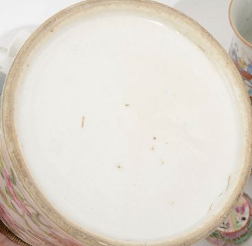 Condition: Bell shaped mug with a chip to rim and a hairline running form rim down side with a flake chip to interior. Glaze imperfection to handle. Famille rose tankard has a restoration to handle, third largest pot has been extensively repired