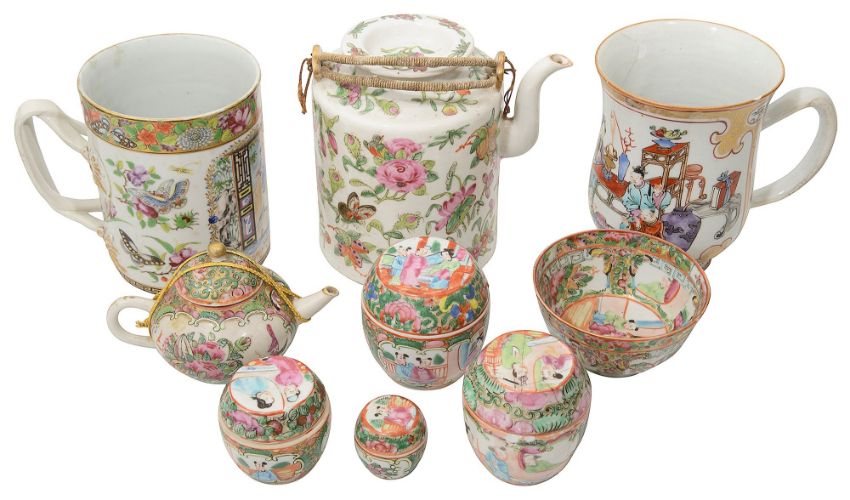 An 18th century Chinese export polychrome tankard and a collection of 19th century Canton famille rose export porcelain