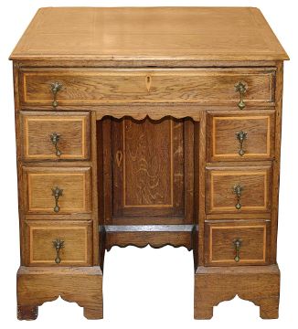 the top with moulded edge, above a long frieze drawer with an arrangement of drawers centred by a recessed cupboard, brass dropped handles, on bracket feet