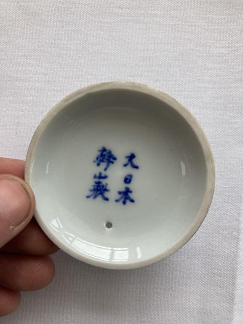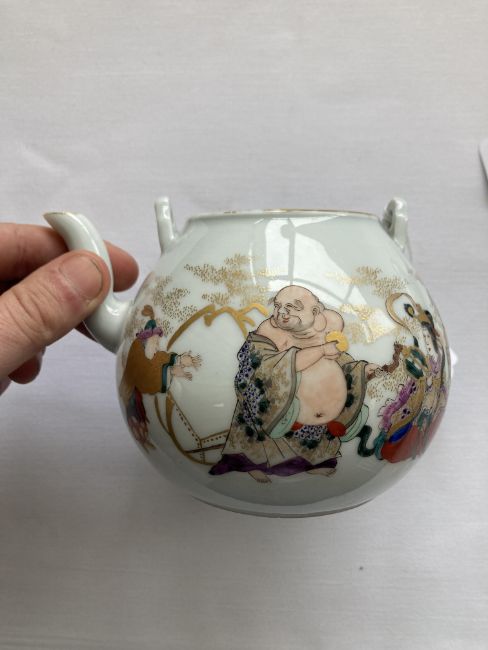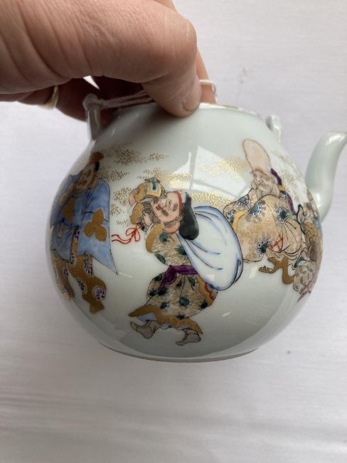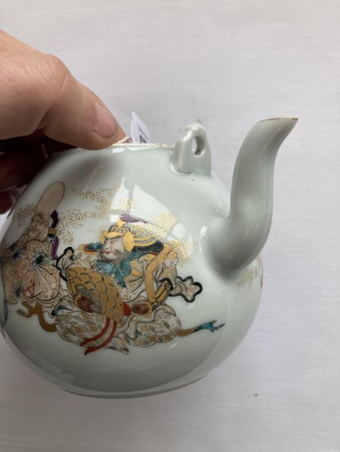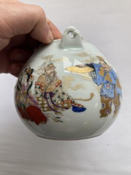 of bulbous form, decorated against the white ground with scene of eight deities including the Shichi Fukujin (Seven Lucky Gods), heightened with gilt, bearing character mark to underside of lid, paper label remnant to base,
