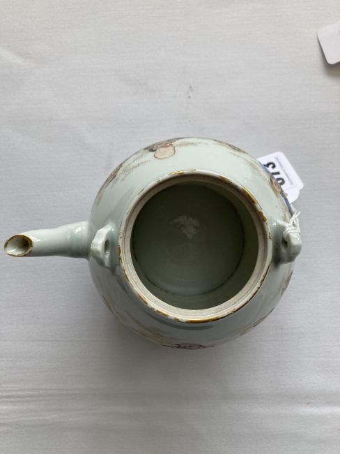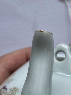 Condition: Lacking handle, small flea bite chip to end of spout, some wear to gilding - otherwise good.