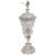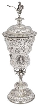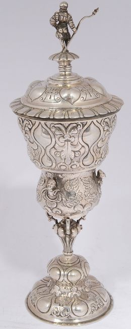 of tapering baluster form with embossed and chased decoration, the domed cover with soldier finial, on a domed circular foot, gilt interior