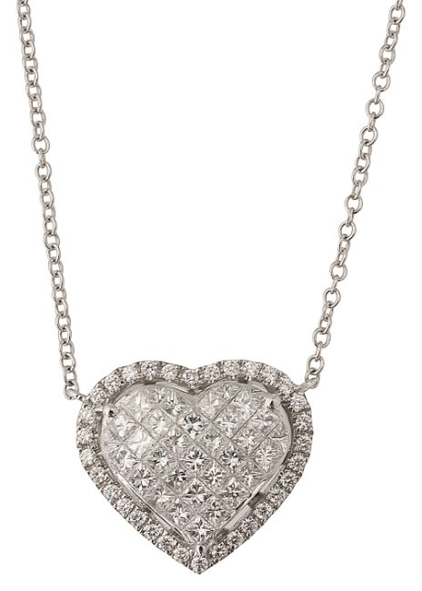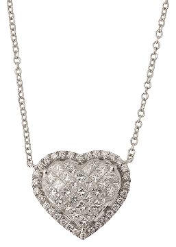 the slightly bombŽ invisibly set princess-cut diamond heart to the border of brilliant-cut diamonds, suspended from a fine trace link chain necklace stamped '750'