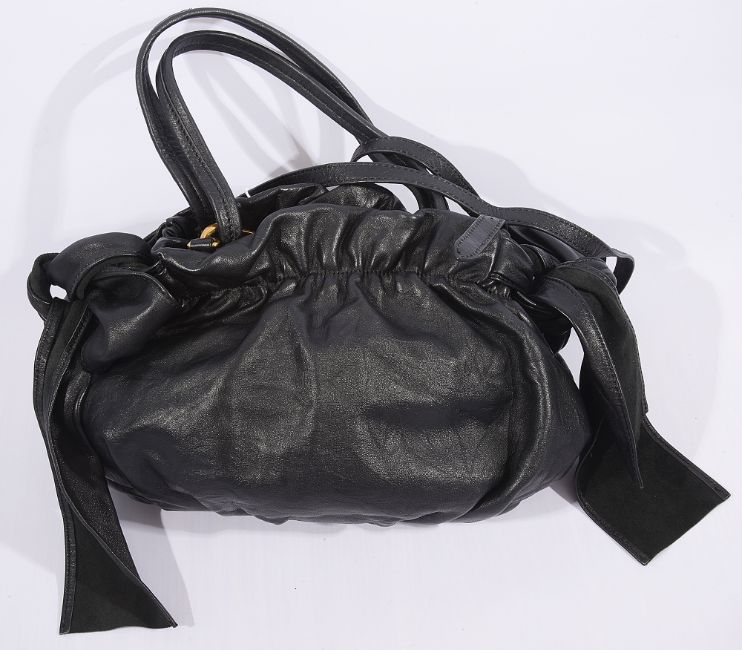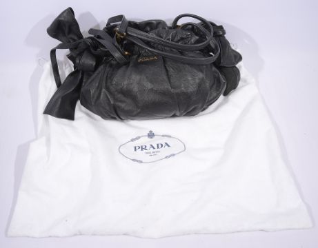 in antique Nappa leather finish, gold tone hardware, top handles and detachable adjustable shoulder strap, leather bows to sides, branded press stud fastening, interior with black branded fabric lining, side pocket and zip pocket, labelled 'Prada, Milano', together with Prada dust bag,