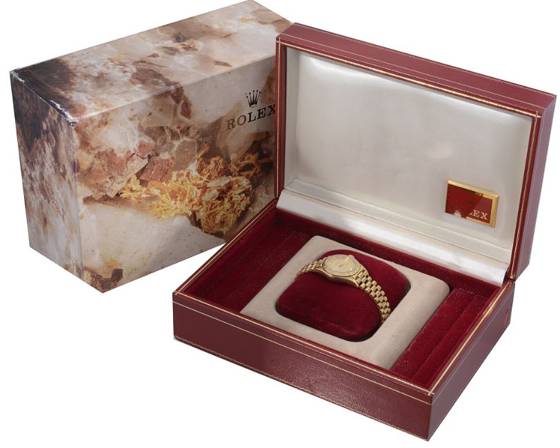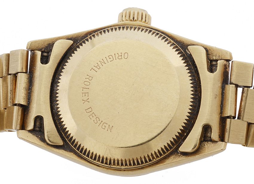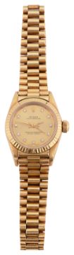 A lady's 18ct yellow gold Rolex Oyster Perpetual wristwatchthe gilt dial signed Rolex Oyster Perpetual Superlative Chronometer with applied hour diamond markers, centre seconds, with president bracelet, contained in an original fitted case with outer card case and original Rolex guarantee from 1992dial width approx 25mmAppears to be in good working order. Movement not tested. In fairly good clean condition. The watch was purchased in 1992 and is complete with its original receipt. The strap and underside of dial is a little grubby and could benefit from a clean. One of the lugs (bottom left of the dial) has a little wear. Box a little tired but still in-tact and in fair condition.