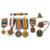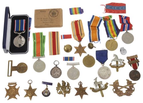 together with assorted WWII war and defence and defence medals, various campaign stars, a cased National Service Medal, cap badges, etc., (qty)