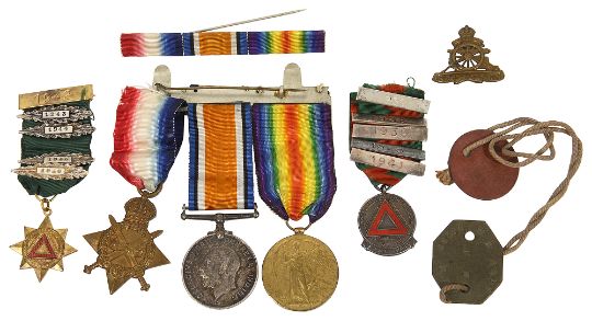 formed of War and Victory medals and 1914-15 campaign star and accompanied by dog tags and five and ten year safe driving medals