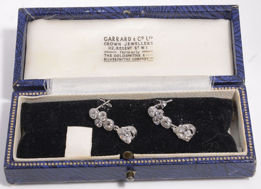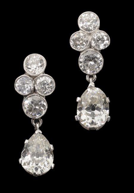 A pair of diamond pendant earringseach with a four stone brilliant cut diamond cluster surmount suspending a pear-shaped old brilliant cut diamond estimated to weigh 1.00ct approx.approximate length 2.3 cm; combined gross weight 4.7gCondition: Pear-shaped diamonds: estimated clarity: SI; estimated colour: J/K Medium florescence