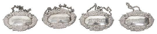 'Whisky', 'Sherry', 'Port' and 'Brandy', oval embossed with shell, scroll and grape border, on chains, (4)