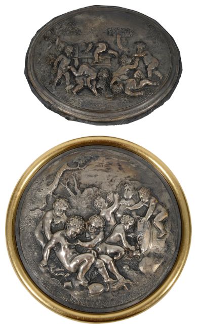 Condition: Round plaque in a modern gilt frame, with minor rubbbing. The other tarnished and some rubbing