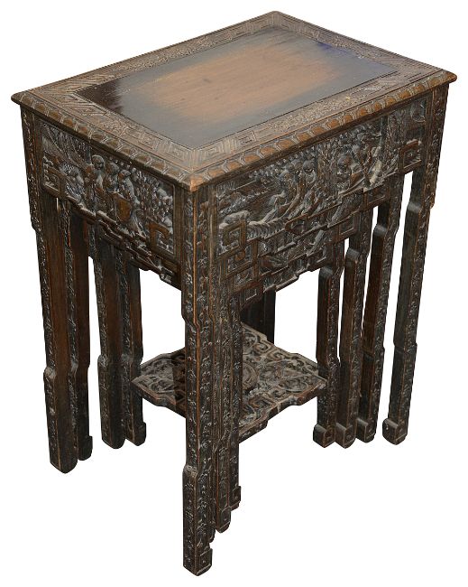the rectangular top carved with geometric key and prunus borders, the sides with figures on shaped square legs carved with flowering prunus, the smallest table with a pierced platform stretcher carved with a shou roundel and bats