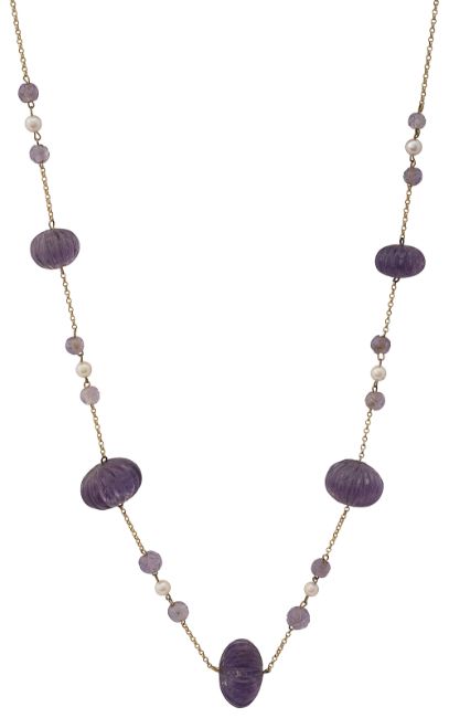 A carved amethyst and cultured pearl long chain necklace, the trace link chain suspending five graduated ridged compressed melon beads (one damaged), each separated by a cultured pearl between two carved amethyst circular beads, together with a spare amethyst bead,